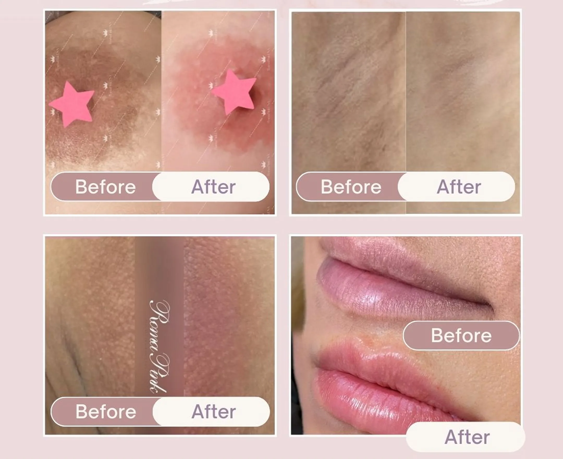 ローマピンクは、唇、バストトップ、デリケートゾーン(VIO)、脇、膝、ヒップラインなど、全身の気になる黒ずみやくすみのケアに対応しています。